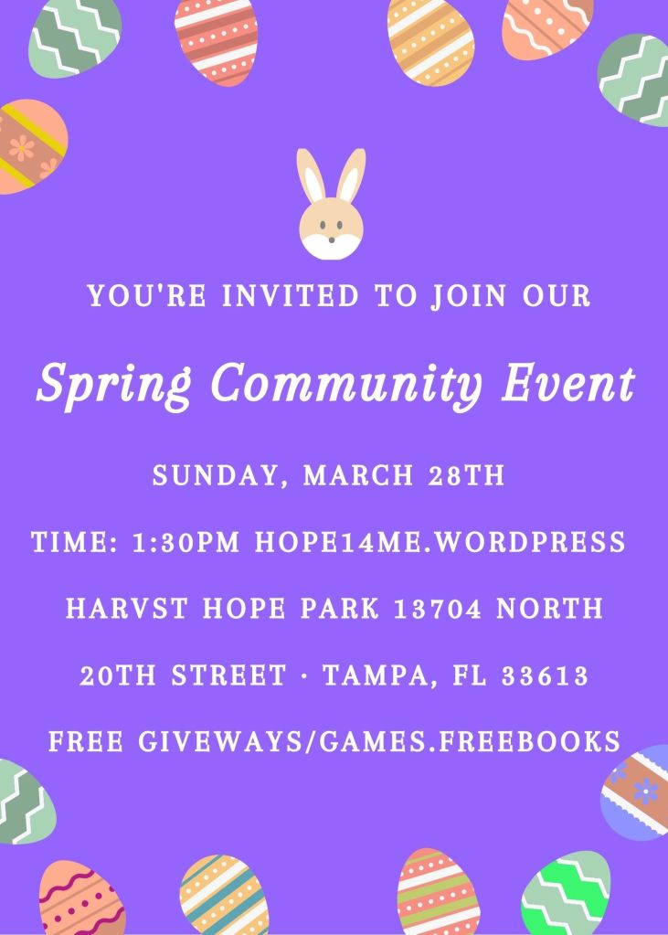 March 23, 2021March 23, 2021 by hope14me Join Us For Our Spring Outreach! FREE GAMES, CHILDREN BOOKS, SNACKS, AND GIFTS Share this: Click to share on X (Opens in new window) X Click to share on Facebook (Opens in new window) Facebook Like Loading... Related