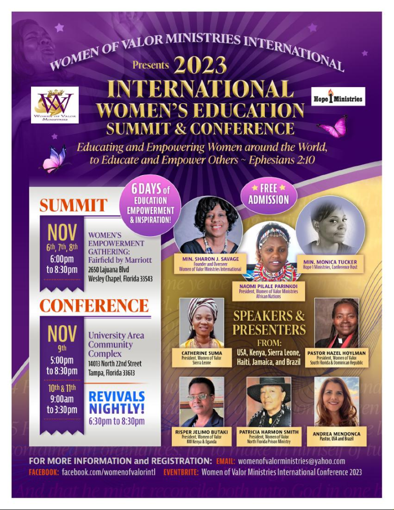 Sponsored by Women of Valor Ministries International, and hosted by Hope1Ministries, there will be two distinct ministry events, which will include a three-day Education Summit followed by a two- and one-half-day Conference.